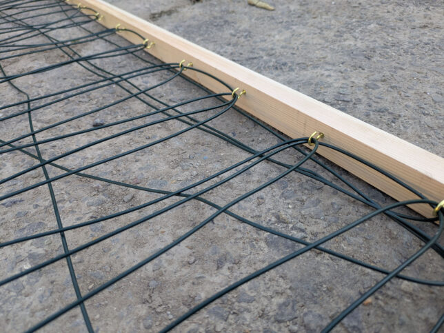 セルトレイ6枚分(120cm x 90cm)を囲う木枠を作って、その中に農電ケーブルを張り巡らせました。